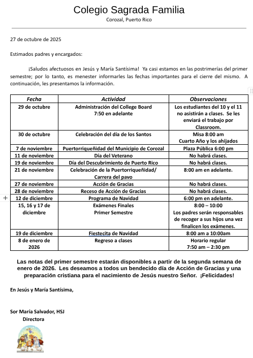 Esperamos en el Todopoderoso que estén bien y a salvo. Durante estos días hemos estado haciendo labores de limpieza y preparación de las instalaciones para la reanudación de las clases. Nuestro Colegio recibe estudiantes de muchos de los pueblos que fueron afectados en el àrea de la montaña. En estos momentos contamos con el servicio de energía eléctrica pero no tenemos servicio de agua potable. Por lo tanto, no se reanudarán las clases hasta nuevo aviso. Tan pronto contemos con ese servicio, le haremos saber cuando será el comienzo de clases.