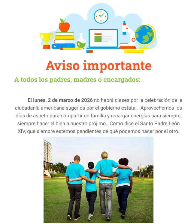 Los estudiantes no tendrán clase debido a que todos los maestros del colegio tendrán taller ese día. Los padres favor de tomar las medidas necesarias con sus hijos.